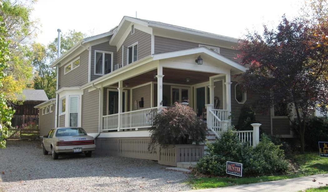 Built in about 1853, the original part of this two-story frame residence was built in the Greek Revival style. The two-story rear wing was added in the late 19th century. Alterations were made to the front of the house to accommodate an apartment. The two-story frame carriage house is historic, and it has board-and-batten siding.