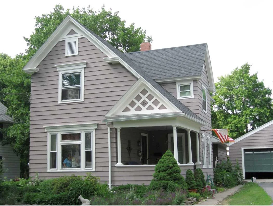 This house was built in about 1895. The L-shaped residence has a cross-gable roof. The large entrance porch has half timbering in the pedimented gable end at the southeast corner.