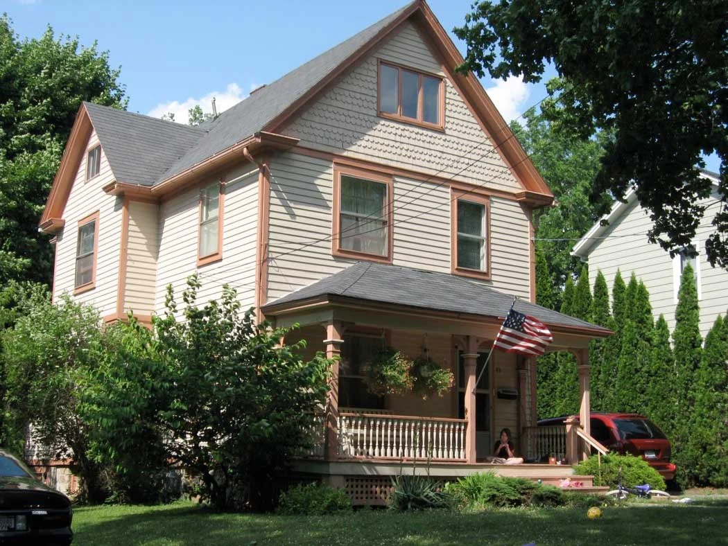 Built in about 1900, this two-story home has a gable roof and scallop shingles in the front gable end.