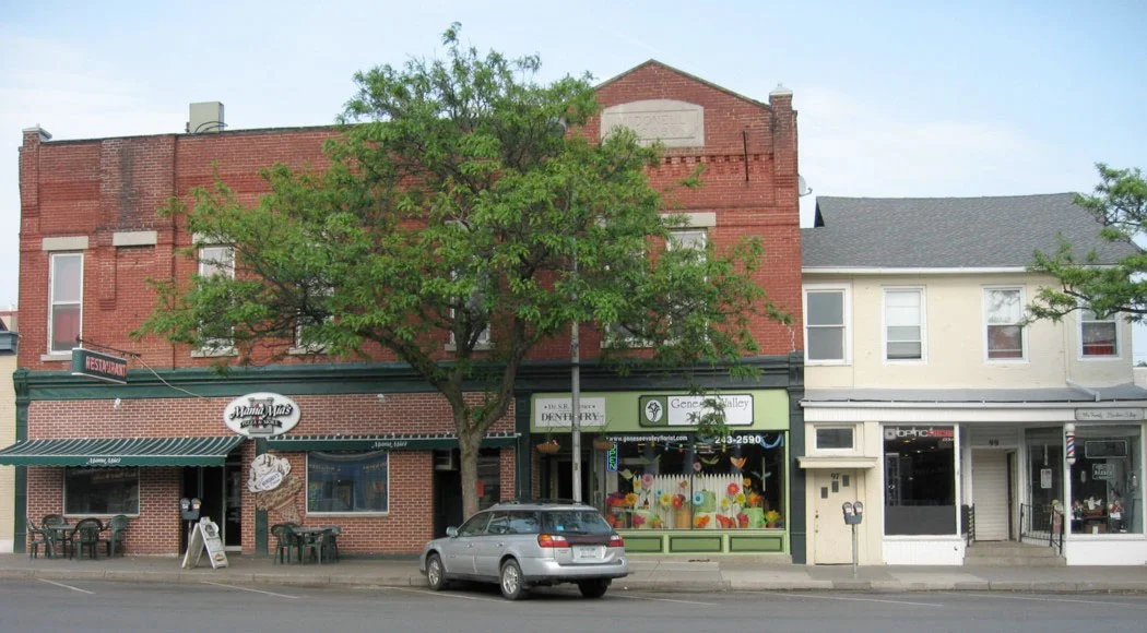 It is thought that the original part of this building was built about 1828 by Asabel Harvey to serve as a bookstore. He later left Geneseo and in 1863 the structure was purchased by Robert Patterson for $1,125.00 for use as a clothing store. He made alterations and improvements, including extending the front out toward the street and installing glass windows. In 1883, he built a 20’ x 20’ one-story addition at the rear. A few years later, he turned the clothing business over to his son, James, who continued to operate it successfully. James’ son, Jonas, took over the business about 1910. In 1923, the family, after 60 years in the clothing business in the same place, moved to a new location and sold the building to Walter Finley. He remodeled it completely for his furniture and undertaking establishment which he conducted here for a few years. Walter Barry purchased the building in 1929. He was a proprietor of the hotel adjoining it on the south and he used this as an annex. The Market Basket rented the lower floor in 1930 and remained here until it relocated across the street in 1935. A variety of businesses have occupied the site since that time.